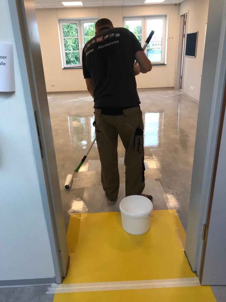 Het gaat om een PVC vloer die wij volledig hebben gerenoveerd. Uiteindelijk voorzien van een nieuwe, matte coating.